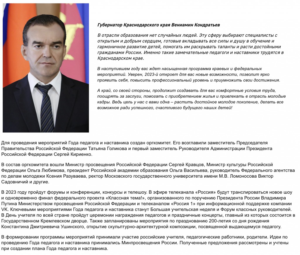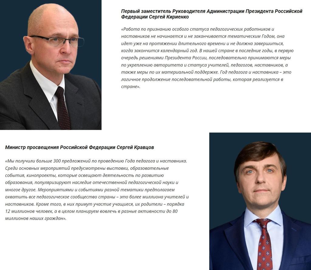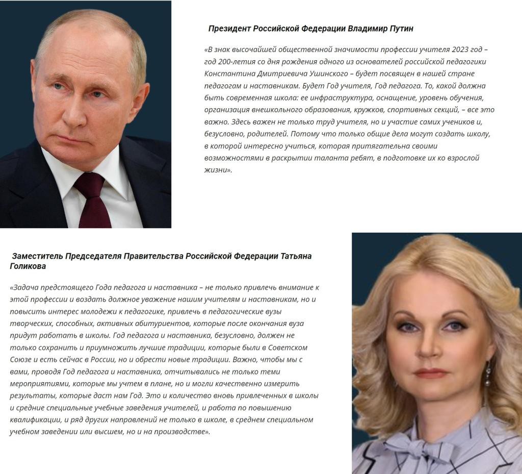 2023 год Указом Президента России Владимира Путина объявлен Годом педагога и наставника. Миссия Года – признание особого статуса педагогических работников, в том числе выполняющих наставническую деятельность. Мероприятия Года педагога и наставника будут направлены на повышение престижа профессии учителя.