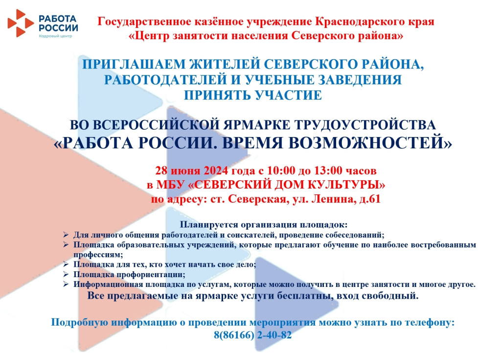 Всероссийская ярмарка трудоустройства "Работа России. Время возможностей" пройдет 28 июня 2024 года в МБУ «Северский дом культуры» по адресу: ст.Северская, ул.Ленина, д.61. с 10-00 до 13-00 час.